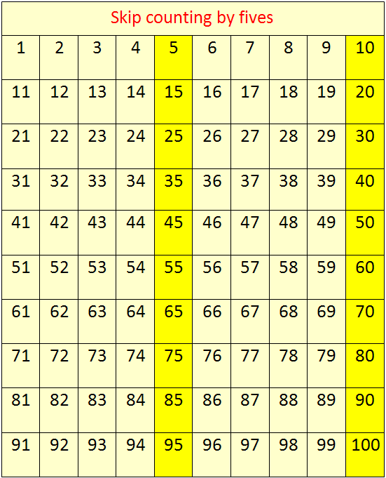 It is important to help them get over . When teaching place value and counting skills, these hundreds charts can be very helpful. This colourful classroom display is a hundreds chart that highlights skip counting by 2, 5 and 10. These free printable skip counting visuals show cute animals skipping over numbers to count by 2s, count by 3s, count by 4s, count by 5s, count . This are counting by 5's numbers.